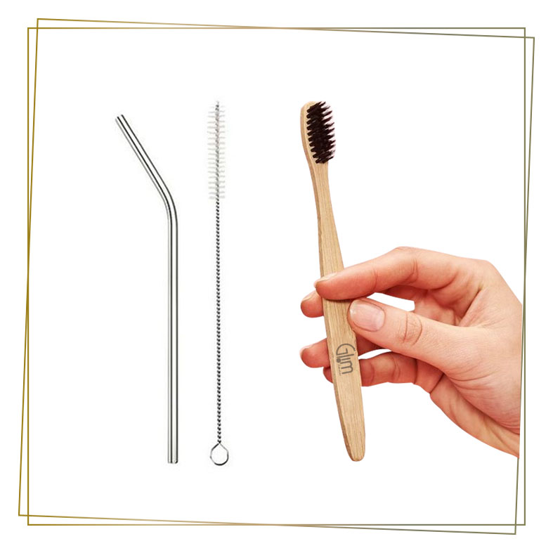 Combo: pitillo acero inoxidable / cepillo limpiador/ cepillo de dientes de Bambú cerdas carbón activado.